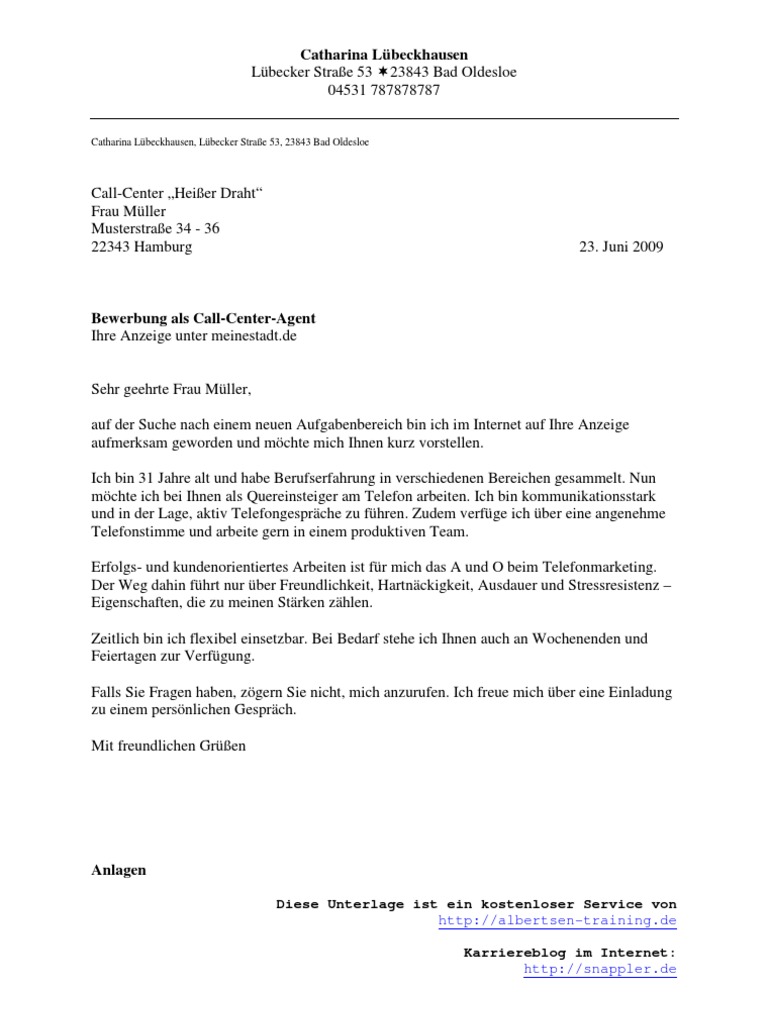 Daniel hartmann mustermail de sehr geehrter herr jšger sie suchen einen dynamischen und engagierten mitarbeiter fÿr ihr callcenter. Das bewerbungsschreiben sollte wie in nahezu jedem anderen berufsbild auch aus lebenslauf anschreiben foto und zeugniskopie bestehen. 1 12345 oldenburg tel. Dabei können sie entweder für ein spezielles unternehmen oder in einem sogenannten contact center in einem großraumbüro arbeiten.